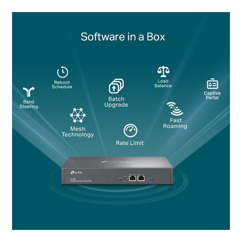 OC300, the professional on-premises hardware controller for the Omada Software Defined Networking (SDN) platform, provides 100% centralized management of Omada access points, Omada switches, and Omada routers—all controlled from a single interface.