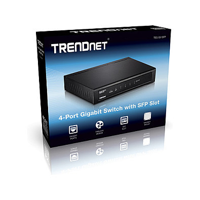 "Trendnet TEG-S51SFP. Switch type: Unmanaged. Basic switching RJ-45 Ethernet ports type: Gigabit Ethernet (10/100/1000), Basic switching RJ-45 Ethernet ports quantity: 4. Full duplex. Switching capacity: 10 Gbit/s. Networking standards: IEEE 802.1p, IEEE 802.3ab, IEEE 802.3u, IEEE 802.3x, IEEE 802.3z. Power connector: DC-in jack. Wall mountable"\n"- 4 x Gigabit ports