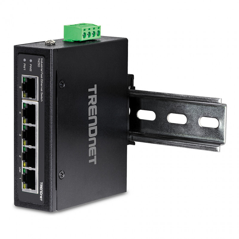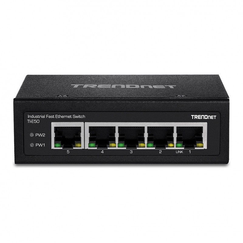 "Trendnet TI-E50. Switch type: Unmanaged. Basic switching RJ-45 Ethernet ports type: Fast Ethernet (10/100), Basic switching RJ-45 Ethernet ports quantity: 5. Full duplex. MAC address table: 1000 entries, Switching capacity: 1 Gbit/s. Networking standards: IEEE 802.3, IEEE 802.3ab, IEEE 802.3u, IEEE 802.3x. DC input voltage: 12 - 56 V. Wall mountable"\n"TRENDnet's Industrial Fast Ethernet DIN-Rail Switches feature a rugged IP30 rated metal enclosure. These industrial Ethernet switches are designed to withstand high levels of vibration and shock, operate in both low and high temperatures for industrial environments within a -40° – 75° C (-40° – 167° F) wide-temperature range. Redundant power inputs with overload current protection on each industrial Ethernet switch minimizes network downtime."