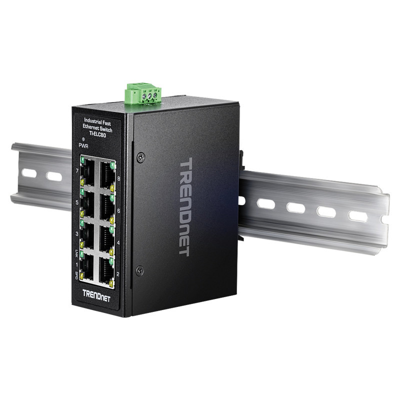 "Trendnet TI-ELC80. Switch type: Unmanaged. Basic switching RJ-45 Ethernet ports type: Fast Ethernet (10/100), Basic switching RJ-45 Ethernet ports quantity: 8. Full duplex. MAC address table: 1000 entries, Switching capacity: 1 Gbit/s. Networking standards: IEEE 802.3, IEEE 802.3u, IEEE 802.3x. DC input voltage: 9.6 - 60 V. Wall mountable"\n"TRENDnet’s 8-Port Industrial Fast Ethernet DIN-Rail Mini Switch, model TI-ELC80, is a reliable and rugged networking solution designed for use in both extreme and demanding environments. This industrial Fast Ethernet DIN-Rail mini switch features a rugged IP30 rated metal enclosure, and is designed to withstand a high degree of vibration and shock, while operating in both high and low temperatures for industrial environments within -40° – 75° C (-40° – 167° F). The hardened industrial switch features five copper Ethernet ports for stable device connections. The mini-sized housing is designed to fit into most compact installation areas."