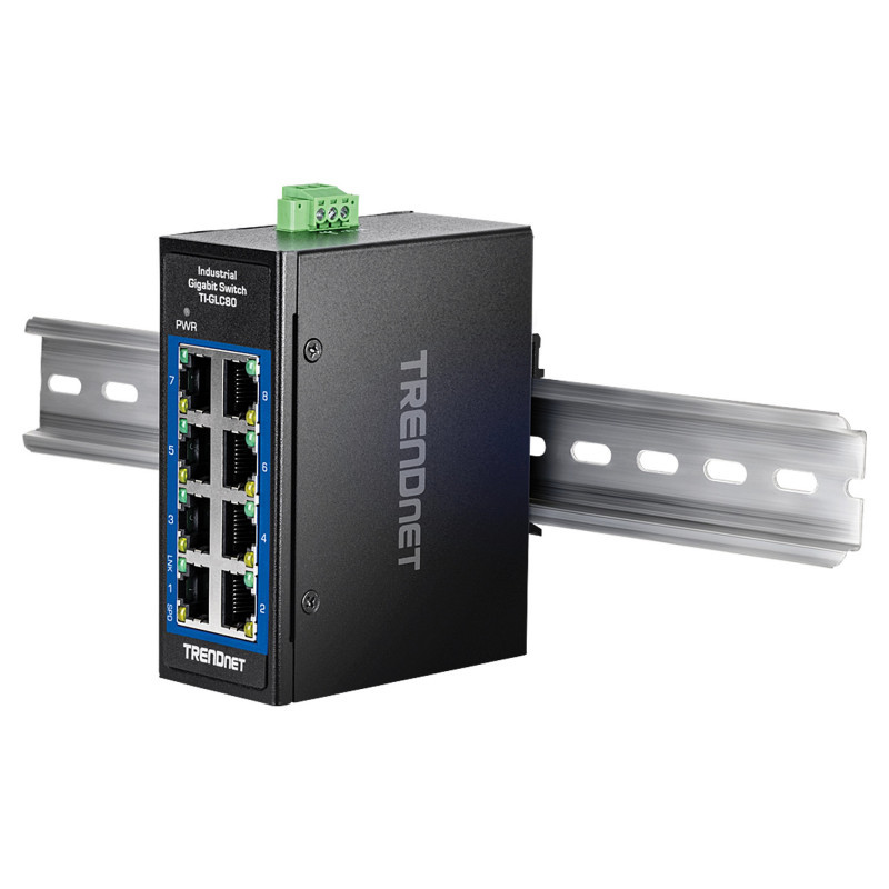 "Trendnet TI-GLC80. Switch type: Unmanaged. Basic switching RJ-45 Ethernet ports type: Gigabit Ethernet (10/100/1000), Basic switching RJ-45 Ethernet ports quantity: 8. Full duplex. MAC address table: 4000 entries, Switching capacity: 16 Gbit/s. Networking standards: IEEE 802.3, IEEE 802.3ab, IEEE 802.3u, IEEE 802.3x. DC input voltage: 9.6 - 60 V. Wall mountable"\n"TRENDnet’s 8-Port Industrial Gigabit DIN-Rail Mini Switch, model TI-GLC80, is a reliable and rugged networking solution that is designed for use in both extreme and demanding environments. This compact industrial switch features a rugged IP30 rated metal enclosure, and is designed to withstand a high degree of vibration and shock, while operating in both high and low temperatures for industrial environments within -40° – 75° C (-40° – 167° F). The hardened industrial mini switch features eight copper Gigabit ports for high-speed device connections. The mini-sized housing is designed to fit into most compact installation areas.