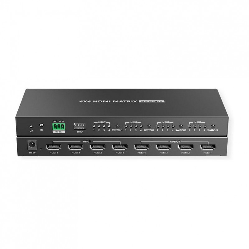 This 4 in 4 out HDMI Matrix can switch 4 HDMI input signals (PC, notebook, etc.) to 4 HDMI displays (monitor, projector, etc.) with resolutions up to 4096x2160@60Hz. It supports multiple switching methods (buttons on the matrix, IR remote control and RS232). Any two of the four HDMI outputs support automatic down-scaling. This matrix can be used in security surveillance, education, training, exhibitions, trade shows, broadcasting, command centers and many other applications.