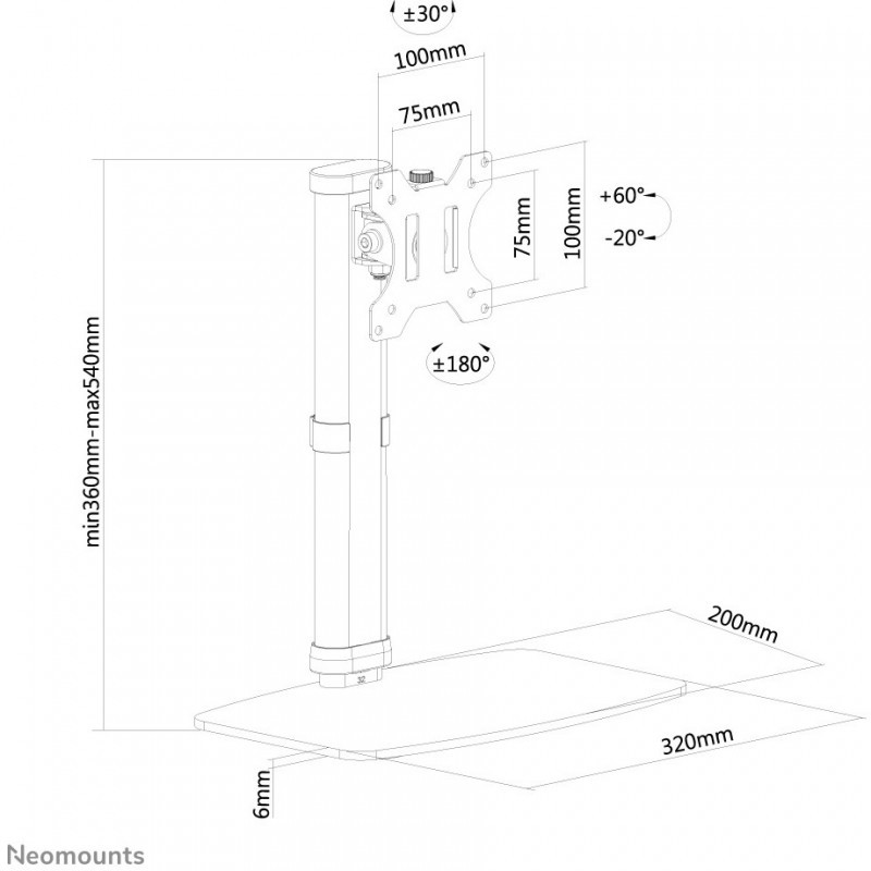 "Neomounts FPMA-D890BLACK Monitor stand 10-30"". Mounting: Freestanding, Maximum weight capacity: 6 kg, Minimum screen size: 25.4 cm (10""), Maximum screen size: 76.2 cm (30""), Minimum VESA mount: 75 x 75 mm, Maximum VESA mount: 100 x 100 mm. Height adjustment, Swivel angle range: 0 - 60°, Tilt angle range: 0 - 80°. Product colour: Black"\n"The Neomounts desk mount, model FPMA-D890BLACK is a tilt-, swivel and rotatable desk mount for flat screens up to 30"". This mount is a great choice for space saving placement on desks using a desk stand.