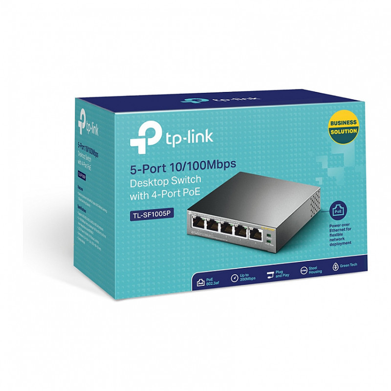 "TP-Link 5-Port 10/100Mbps Desktop PoE Switch with 4-Port. Switch type: Unmanaged. Basic switching RJ-45 Ethernet ports type: Fast Ethernet (10/100), Basic switching RJ-45 Ethernet ports quantity: 5. Full duplex. MAC address table: 2000 entries, Switching capacity: 1 Gbit/s. Networking standards: IEEE 802.3af, IEEE 802.3x. DC input voltage: 53.5 V. Power over Ethernet (PoE)"\n"PoE Switches for Your Ultra Convenience