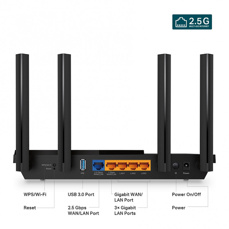 "TP-Link Archer AX3000 Multi-Gigabit Wi-Fi 6 Router with 2.5G Port. WAN connection type: RJ-45. Wi-Fi band: Dual-band (2.4 GHz / 5 GHz), Top Wi-Fi standard: Wi-Fi 6 (802.11ax), WLAN data transfer rate (max): 2402 Mbit/s. Ethernet LAN interface type: Gigabit Ethernet, Networking standards: IEEE 802.11a, IEEE 802.11ac, IEEE 802.11ax, IEEE 802.11b, IEEE 802.11g, IEEE 802.11n, VPN server: OpenVPN, PPTP, L2TP. Security algorithms: WPA, WPA2, WPA3, Firewall security: SPI Firewall, NAT functionality: • Port Forwarding • Port Triggering • DMZ • UPnP. Product type: Desktop/pole router, Product colour: Black"\n"The New Era of Connectivity with 2.5G Ports
