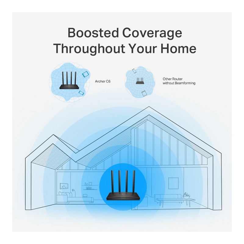 Four external antennas and one internal antenna send WiFi signals to every corner of your home. Stay connected and enjoy fast WiFi whether you are lounging on the sofa or on the balcony. With a powerful chipset, the Archer C6 provides ideal WiFi coverage.