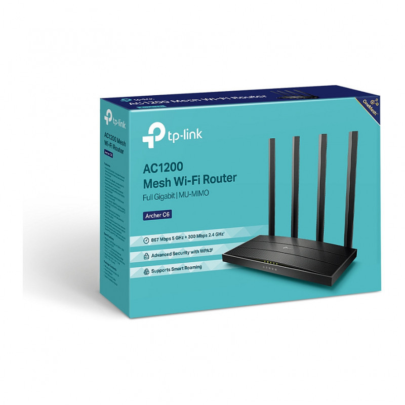 "TP-Link Archer C6. WAN connection type: RJ-45. Wi-Fi band: Dual-band (2.4 GHz / 5 GHz), Top Wi-Fi standard: Wi-Fi 5 (802.11ac), WLAN data transfer rate (max): 867 Mbit/s. Ethernet LAN interface type: Fast Ethernet, Ethernet LAN data rates: 10,100 Mbit/s, Cabling technology: 10/100Base-T(X). Security algorithms: 64-bit WEP, 128-bit WEP, WPA, WPA-PSK, WPA2, WPA2-PSK. VoIP protocols: IPv4, IPv6"\n"Smooth Entertainment with AC1200 Dual Band WiFi