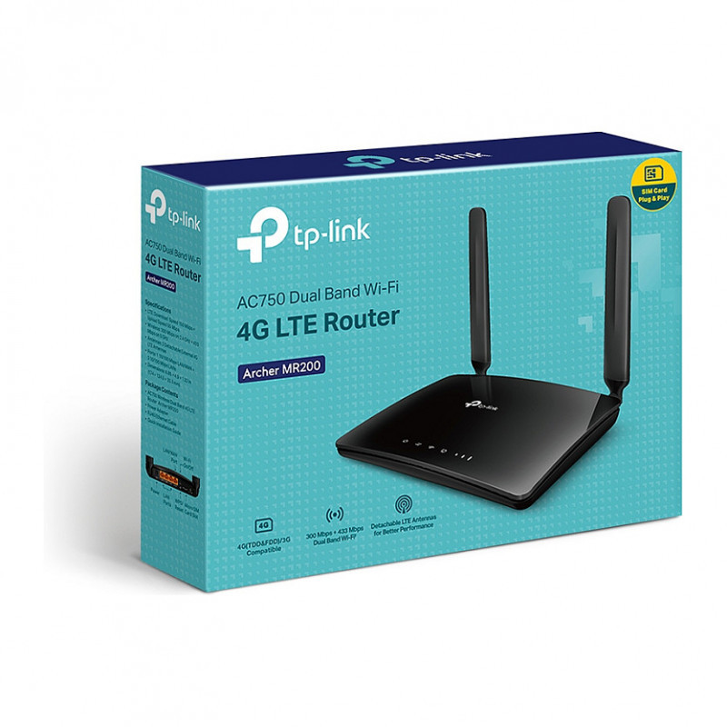 "TP-Link Archer MR200. Wi-Fi band: Dual-band (2.4 GHz / 5 GHz), Top Wi-Fi standard: Wi-Fi 5 (802.11ac), WLAN data transfer rate (max): 433 Mbit/s. Ethernet LAN interface type: Fast Ethernet, Ethernet LAN data rates: 10,100 Mbit/s, Cabling technology: 10/100Base-T(X). Mobile network generation: 4G, 2G standards: Edge, GPRS, GSM, 3G standards: DC-HSPA+, HSPA, HSPA+, UMTS. Security algorithms: 64-bit WEP, 128-bit WEP, WPA, WPA-PSK, WPA2, WPA2-PSK, Firewall security: DoS, SPI Firewall, IP and MAC Address Binding. Data link protocols: IPv4, IPv6"\n"Share Your 4G LTE Network
