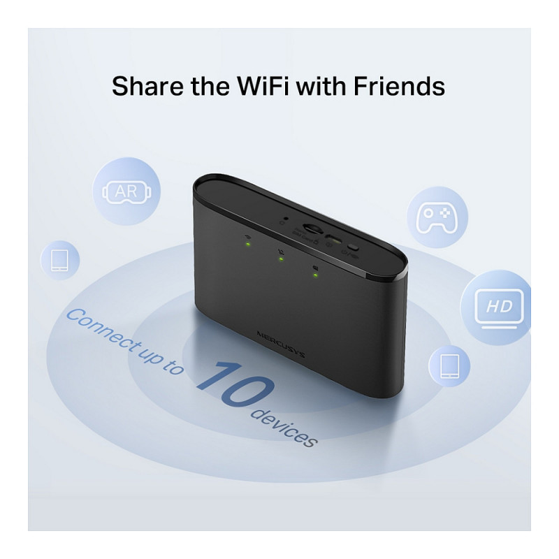 "Mercusys 4G LTE Mobile Wi-Fi. Device type: Cellular network router, Product colour: Black, LED indicators: Battery level, Wi-Fi. Wi-Fi standards: 802.11a, 802.11b, 802.11g, Wi-Fi 4 (802.11n), WLAN data transfer rates supported: 11,54,150 Mbit/s, Wi-Fi frequency: 2.4 GHz. Data network: 4G, 3G standards: HSPA+, UMTS, 4G standard: LTE-TDD & LTE-FDD. USB port type: Micro-USB. Cables included: Micro-USB"\n"Go Anywhere and Connect Everywhere with Superfast 4G LTE