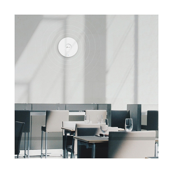 "TP-Link Omada AX5400 Ceiling Mount WiFi 6 Access Point. 2.4 GHz, 5 GHz, Maximum data transfer rate: 5400 Mbit/s, Ethernet LAN data rates: 2500 Mbit/s. Power over Ethernet (PoE). Product colour: White"\n"High-End Business WiFi 6 to Power Up Your Business