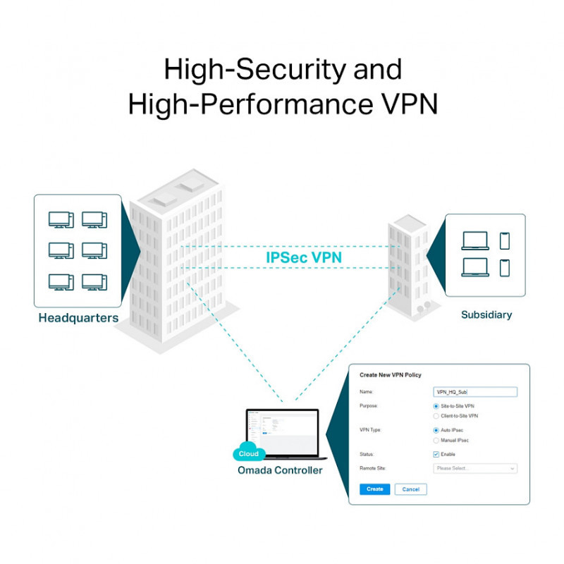 Pass-through traffic and a variety of VPN protocols, such as IPSec/SSL/Wireguard/PPTP/L2TP VPN, are available on ER706W, giving consumers versatile options. One-click auto IPSec VPN simplifies VPN configuration and facilitates network management and deployment. The router also features a built-in hardware engine to boost VPN performance.