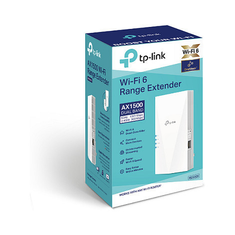 "TP-Link RE500X. Type: Network transmitter & receiver, Data transfer rate: 1200 Mbit/s, Ethernet LAN data rates: 1000 Mbit/s. Antenna type: Internal, Transmitting power (CE): 2.4 GHz ≤20dBm, 5 GHz ≤30dBm. Cabling technology: 10/100/1000Base-T(X), Networking standards: IEEE 802.11a, IEEE 802.11ac, IEEE 802.11ax, IEEE 802.11b, IEEE 802.11g, IEEE 802.11n, Wi-Fi standards: 802.11a, 802.11b, 802.11g, Wi-Fi 4 (802.11n), Wi-Fi 5 (802.11ac), Wi-Fi 6 (802.11ax). Product colour: White, Quantity per pack: 1 pc(s). AC input voltage: 100 - 240 V, AC input frequency: 50/60 Hz, Power consumption (max): 10 W"\n"Eliminate Dead Zones with Powerful WiFi