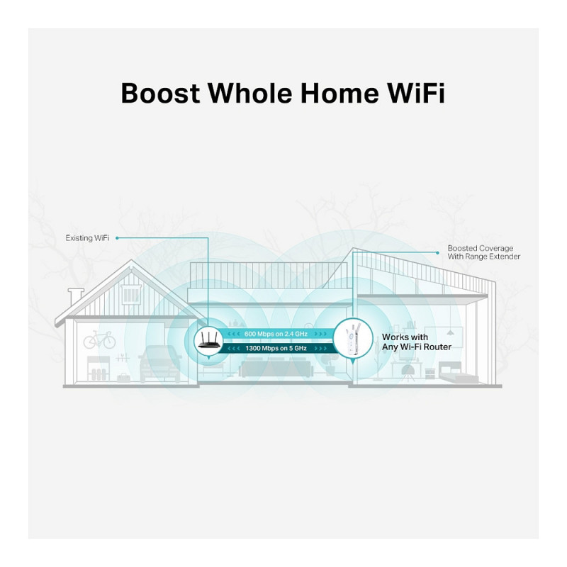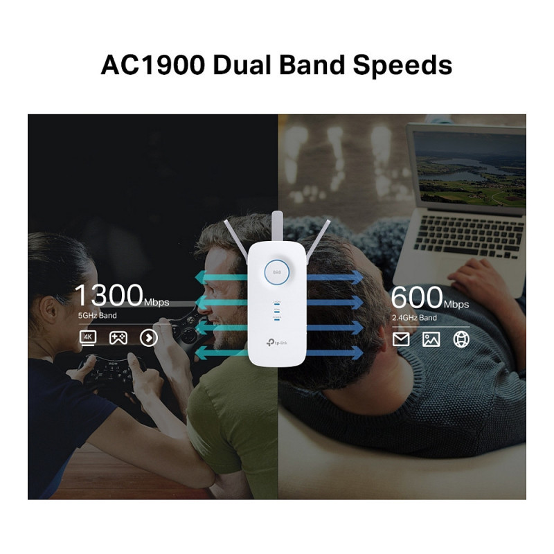 RE550 delivers dual band (2.4 GHz and 5 GHz) to transmit Wi-Fi signals, doubling the performance of each band. It enables you to keep more devices connected at the same time with its 600 Mbps 2.4 GHz and 1300 Mbps 5 GHz dual bands. Use the 2.4 GHz band to send email and browse the web and the 5 GHz band for gaming and HD streaming.