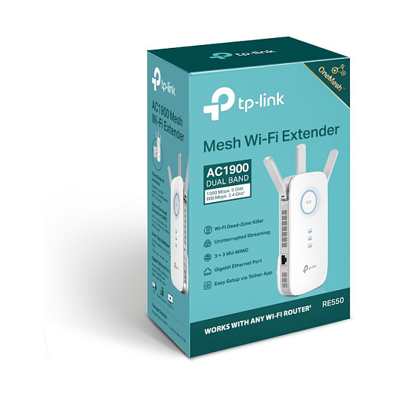 "TP-Link RE550. Type: Network transmitter & receiver, Data transfer rate: 1300 Mbit/s, Ethernet LAN data rates: 10,100,1000 Mbit/s. Antenna type: External, Transmitting power (CE): 2.4 GHz ≤20dBm, 5 GHz ≤23dBm. Cabling technology: 10/100/1000Base-T(X), Networking standards: IEEE 802.11a, IEEE 802.11ac, IEEE 802.11b, IEEE 802.11g, IEEE 802.11n, IEEE 802.3, IEEE 802.3ab,..., Wi-Fi standards: 802.11a, 802.11b, 802.11g, Wi-Fi 4 (802.11n), Wi-Fi 5 (802.11ac). Product colour: White, Quantity per pack: 1 pc(s). AC input voltage: 100 - 240 V, AC input frequency: 50/60 Hz, Power consumption (max): 10 W"\n"Boost Whole Home Wi-Fi with Your Existing Router