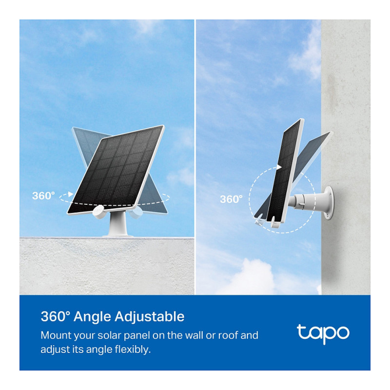 "TP-Link Tapo Solar Panel. Rated power: 4.5 W, Minimum output voltage: 5.2 V. Tilt angle range: 0 - 360°, International Protection (IP) code: IP65, USB connector type: Micro-USB. Package width: 200 mm, Package depth: 266 mm, Package height: 88 mm. Width: 238 mm, Depth: 174.8 mm, Height: 17.5 mm"\n"Non-Stop Power,