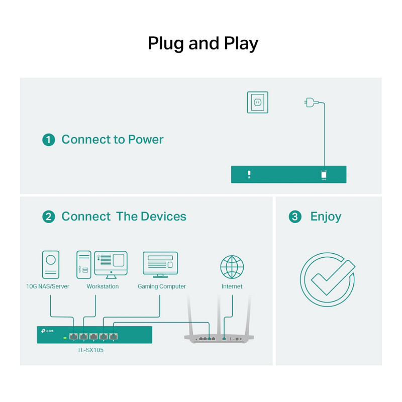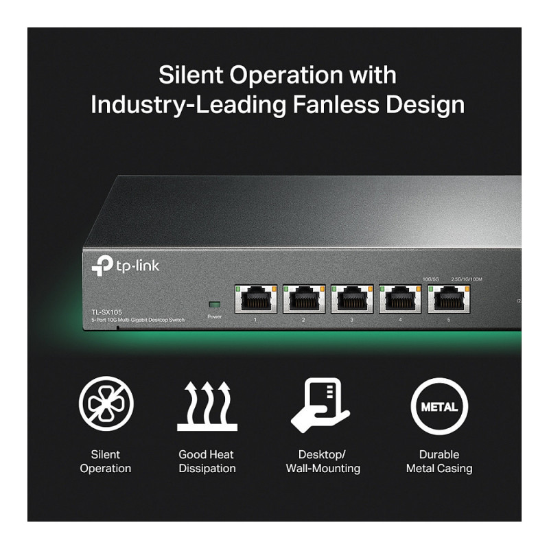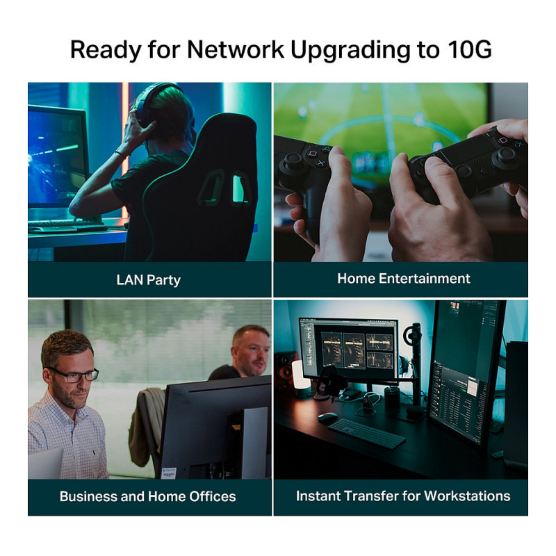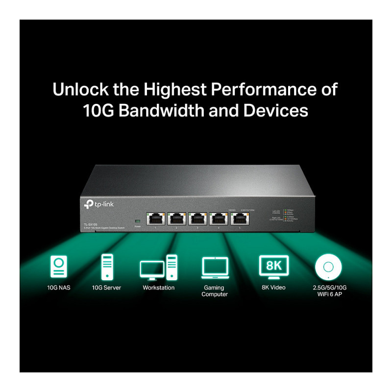 As the flagship 10G product, TL-SX105 is a 5-port 10G desktop switch, providing up to 100 Gbps of switching capacity. Auto-negotiation 5-speed (100Mbps/1G/2.5G/5G/10G) connections sense the link speeds and intelligently adjust for compatibility and optimal performance for all your devices, including 10G NAS, 10G server, workstation, gaming computer, 2.5G/5G/10G WiFi 6 AP, 8K video, desktop, and more.
