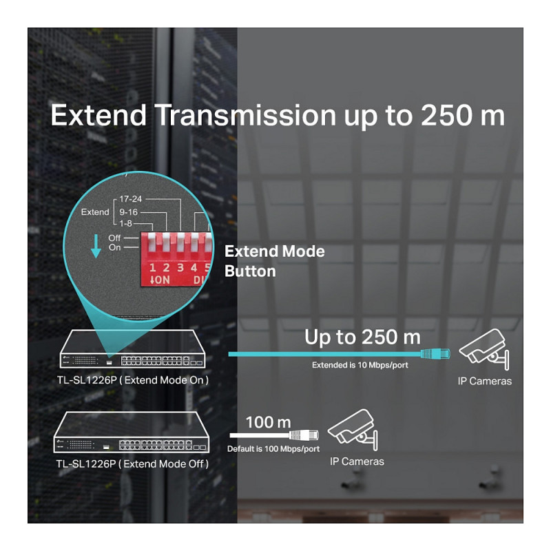 With extend mode, the PoE transmission distance reaches up to 250 m — perfect for IP Camera deployment in large areas.