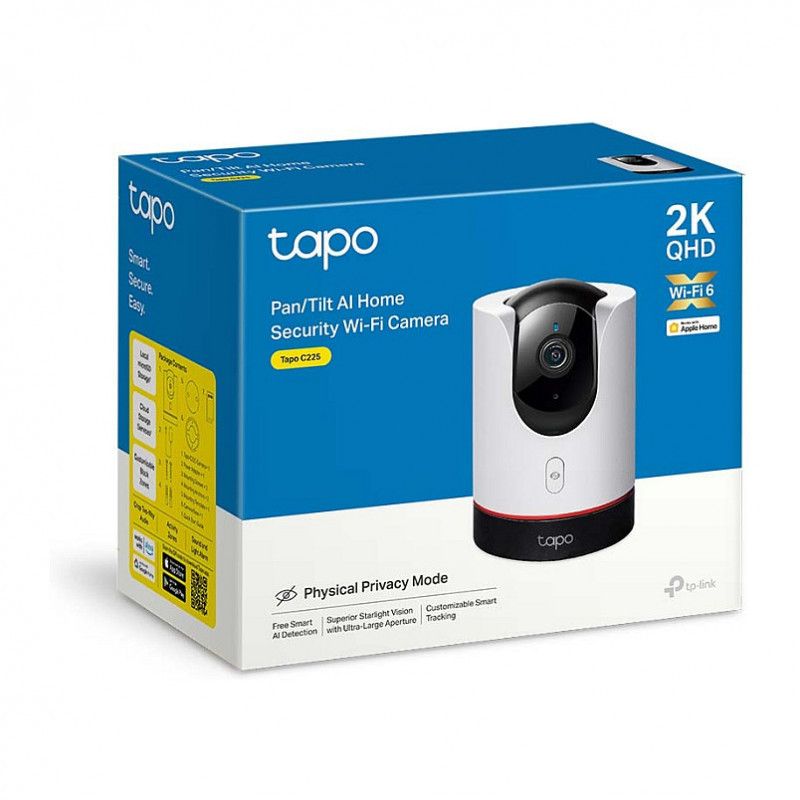 "TP-Link Tapo Pan/Tilt AI Home Security Wi-Fi Camera. Type: IP security camera, Placement supported: Indoor, Connectivity technology: Wireless. Mounting type: Desk, Product colour: Black, White, Form factor: Tower. Field of view (FOV) angle: 360°, Angle of rotation: 360°, Tilt angle range: 0 - 149°. Sensor type: Starlight, Optical sensor size: 25.4 / 3 mm (1 / 3""), Effective sensor resolution: 1440 pixels. Fixed focal length: 4 mm"\n"Smart. Secure. Easy.