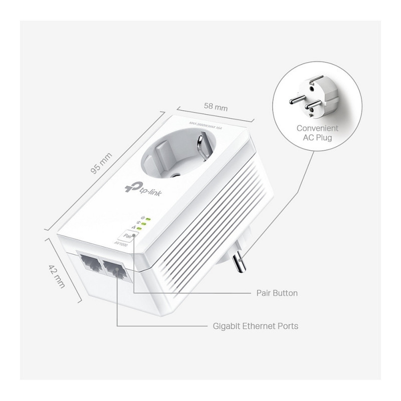 "TP-Link TL-PA7027P KIT. Maximum data transfer rate: 1000 Mbit/s, Networking standards: IEEE 1901, IEEE 802.3, IEEE 802.3u, Power plug: Type E / F. Power consumption (typical): 4 W, Power consumption (standby): 0.84 W. Product colour: White, Antenna type: Internal, LED indicators: LAN, Power. Windows operating systems supported: Windows 7, Windows 8, Windows 8.1, Windows Vista, Windows XP. Width: 58 mm, Depth: 42 mm, Height: 95 mm"\n"Extend a Gigabit Network via