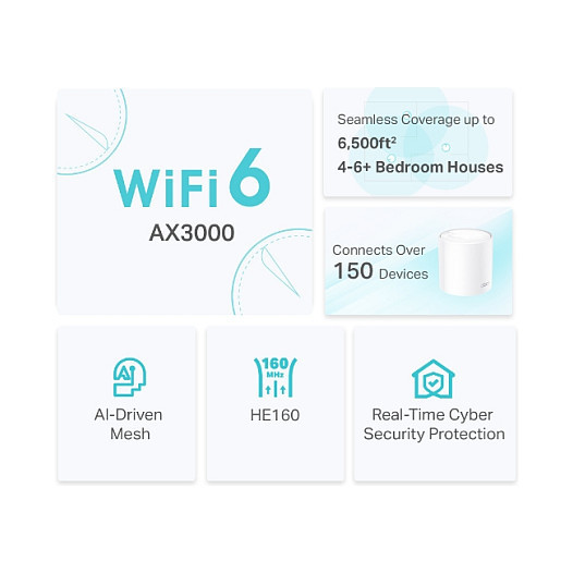 "TP-Link AX3000 Whole Home Mesh WiFi 6 System, 3-Pack. Product colour: White, Antenna type: Internal, Transmit power: CE: <20 dBm (2.4 GHz) <23 dBm (5 GHz) FCC: <30 dBm (2.4 GHz) <30 dBm (5 GHz). Wi-Fi band: Dual-band (2.4 GHz / 5 GHz), Top Wi-Fi standard: Wi-Fi 6 (802.11ax), Wi-Fi standards: 802.11a, 802.11b, 802.11g, Wi-Fi 4 (802.11n), Wi-Fi 5 (802.11ac), Wi-Fi 6 (802.11ax). Processor frequency: 1 GHz, Firewall security: SPI, Parental control features: Custom profiles, Time controls, Weekly/monthly reports. AC adapter output voltage: 12 V, AC adapter output current: 1.5 A. Compliance certificates: CE, RoHS"\n"Superior Mesh WiFi, Everywhere.