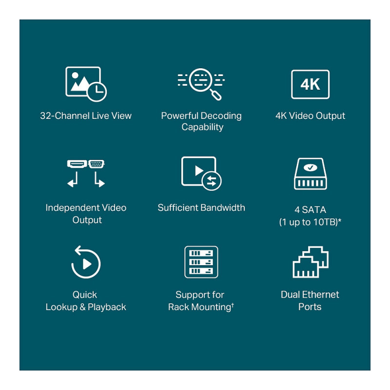 "TP-Link VIGI 32 Channel Network Video Recorder. Video input channels: 32 channels, Maximum resolution: 3840 x 2160 pixels, Number of simultaneously playbacked channels: 16 channels. Maximum storage capacity: 10 TB, HDD interface: SATA. Ethernet LAN data rates: 10,100,1000 Mbit/s, Supported network protocols: UPnP, NTP, ONVIF, CGI. Product colour: Black. Power consumption (max): 48 W, AC input voltage: 100 - 240 V, AC input frequency: 50/60 Hz"\n"Security Never Shuts Down