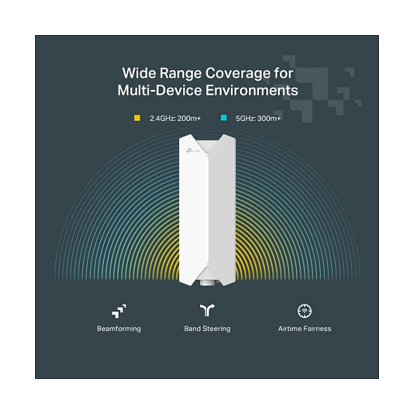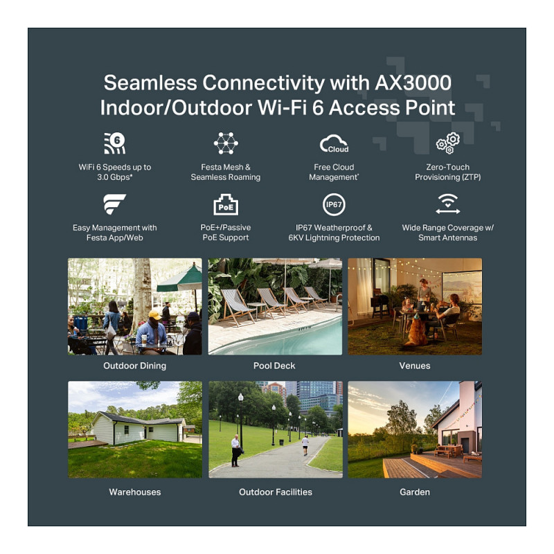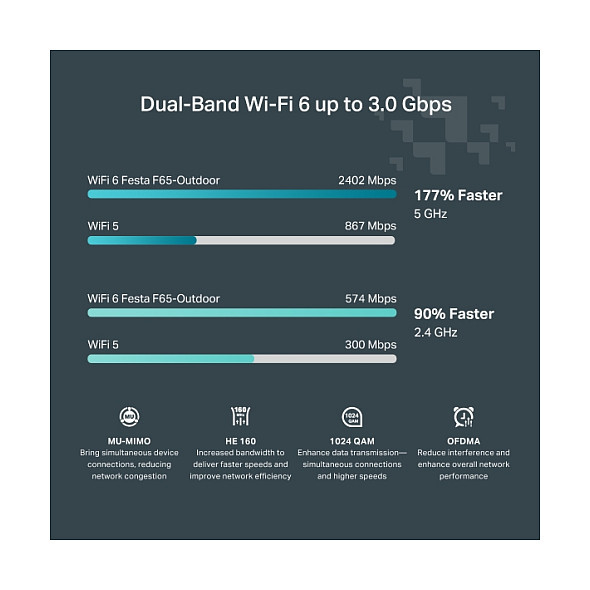 "TP-Link Festa F65-Outdoor. 2.4 GHz, 5 GHz, Maximum data transfer rate: 3000 Mbit/s. Security algorithms: WPA-Enterprise, WPA-Personal, WPA2-Enterprise, WPA2-Personal, WPA3-Enterprise, WPA3-Personal. Power over Ethernet (PoE). Product colour: White"\n"Festa 一 A Networking Solution Built For Small Business, No IT Required