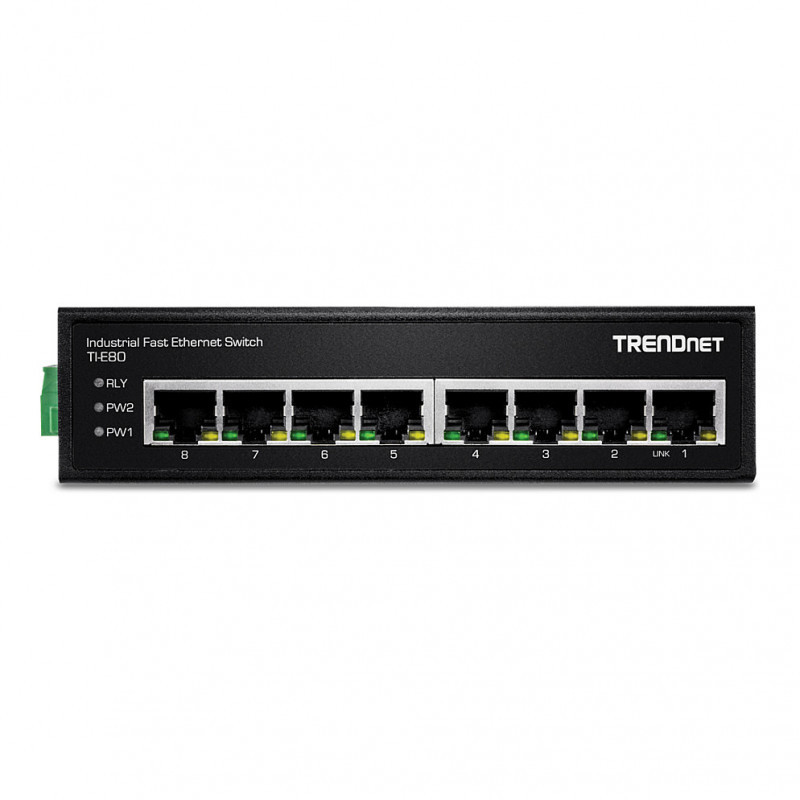 "Trendnet TI-E80. Switch type: Unmanaged. Basic switching RJ-45 Ethernet ports type: Fast Ethernet (10/100), Basic switching RJ-45 Ethernet ports quantity: 8. Full duplex. MAC address table: 1000 entries, Switching capacity: 1.6 Gbit/s. Networking standards: IEEE 802.3, IEEE 802.3ab, IEEE 802.3u, IEEE 802.3x. DC input voltage: 12 - 56 V. Wall mountable"\n"TRENDnet's Industrial Fast Ethernet DIN-Rail Switches feature a rugged IP30 rated metal enclosure. These industrial Ethernet switches are designed to withstand high levels of vibration and shock, operate in both low and high temperatures for industrial environments within a -40° – 75° C (-40° – 167° F) wide-temperature range. Redundant power inputs with overload current protection on each industrial Ethernet switch minimizes network downtime."