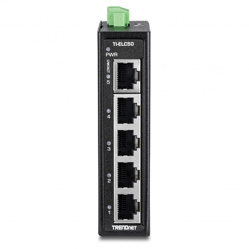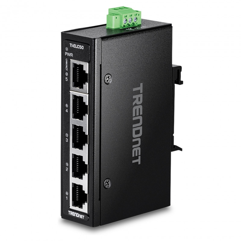 "Trendnet TI-ELC50. Switch type: Unmanaged. Basic switching RJ-45 Ethernet ports type: Fast Ethernet (10/100), Basic switching RJ-45 Ethernet ports quantity: 5. Full duplex. MAC address table: 1000 entries, Switching capacity: 1 Gbit/s. Networking standards: IEEE 802.3, IEEE 802.3u, IEEE 802.3x. DC input voltage: 9.6 - 60 V. Wall mountable"\n"TRENDnet’s 5-Port Industrial Fast Ethernet DIN-Rail Mini Switch, model TI-ELC50, is a reliable and rugged networking solution designed for use in both extreme and demanding environments. This industrial Fast Ethernet DIN-Rail mini switch features a rugged IP30 rated metal enclosure, and is designed to withstand a high degree of vibration and shock, while operating in both high and low temperatures for industrial environments within -40° – 75° C (-40° – 167° F). The hardened industrial switch features five copper Ethernet ports for stable device connections. The mini-sized housing is designed to fit into most compact installation areas.