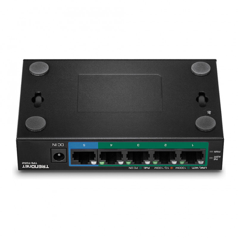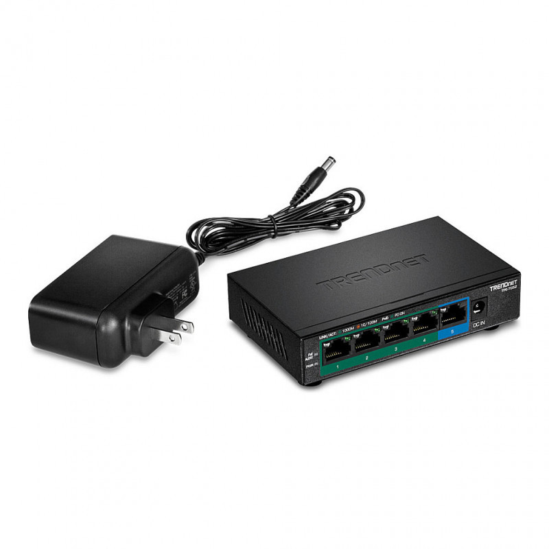 "Trendnet TPE-TG52. Switch type: Unmanaged. Basic switching RJ-45 Ethernet ports type: Gigabit Ethernet (10/100/1000), Basic switching RJ-45 Ethernet ports quantity: 5. Switching optical modules type: Gigabit Ethernet. Full duplex. MAC address table: 2000 entries, Switching capacity: 10 Gbit/s. Networking standards: IEEE 802.3, IEEE 802.3ab, IEEE 802.3af, IEEE 802.3at, IEEE 802.3p, IEEE 802.3u, IEEE 802.3x. DC input voltage: 54 V. Power connector: DC-in jack. Power over Ethernet (PoE). Wall mountable"\n"TRENDnet's 5-Port Gigabit PoE+ Switch, model TPE-TG52, reduces equipment and installation costs by delivering data and power over existing Ethernet cables. With PoE technology, users only need one set of cables to deliver both data and power. This compact network switch features four gigabit PoE+ ports and one gigabit port, with a 32W total PoE power budget. The TPE-TG52 PoE+ switch allows you to network PoE devices, such as wireless access points, IP cameras, VoIP phones, IP video encoders, access controls, and more. It features a fanless design, and has a convenient option for wall mounting.