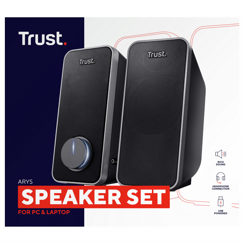 "Trust 20179. Recommended usage: PC. Audio output channels: 2.0 channels. Connectivity technology: Wired. RMS rated power: 14 W. Product colour: Black"\n"Premium design speaker set with rich sound and deep bass, for PC and laptop
