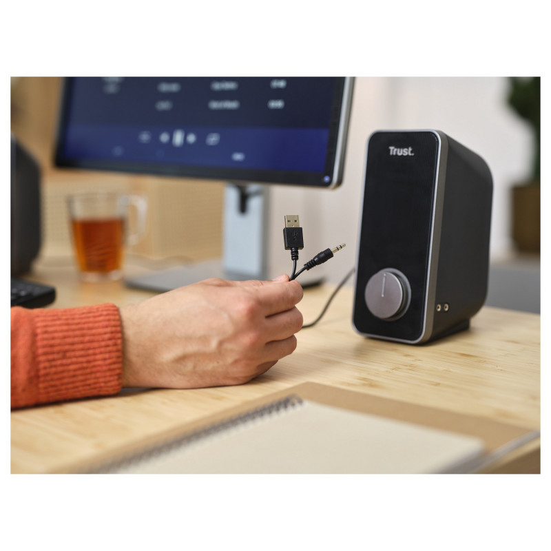 The speakers can be placed anywhere, thanks to the compact design with stylish metal grill, these are a perfect addition to any desk. The Trust Arys is USB powered which means that you can install the speakers very easily. Simply connect the USB cable to your computer and plug in the 3.5mm jack plug and the speaker will channel all your sounds.