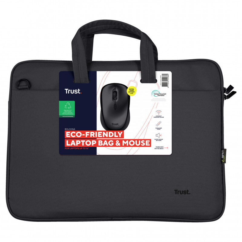 "Trust Bologna. Case type: Briefcase, Maximum screen size: 40.6 cm (16""). Weight: 430 g. Surface coloration: Monochromatic"\n"Working for the world