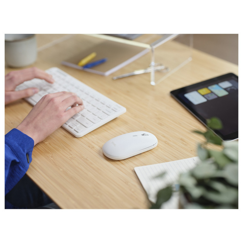 "Trust Lyra Multi-Device Wireless Keyboard & Mouse. Keyboard form factor: Mini. Keyboard style: Straight. Connectivity technology: Wireless, Device interface: RF Wireless + Bluetooth, Keyboard key switch: Scissor key switch, Keyboard layout: QWERTZ, Recommended usage: Office. Product colour: White. Mouse included"\n"Multi-Device Wireless Keyboard & Mouse
