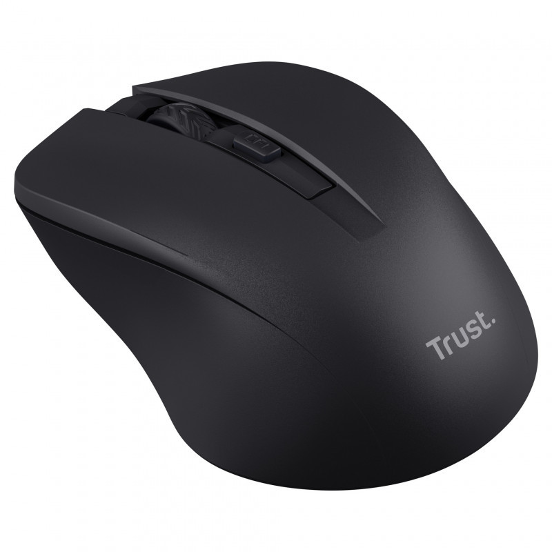 "Trust Mydo. Form factor: Ambidextrous. Movement detection technology: Optical, Device interface: RF Wireless, Movement resolution: 1800 DPI, Buttons type: Pressed buttons, Buttons quantity: 4, Scroll type: Wheel. Power source: Batteries. Product colour: Black"\n"Comfortable wireless mouse with advanced silent buttons
