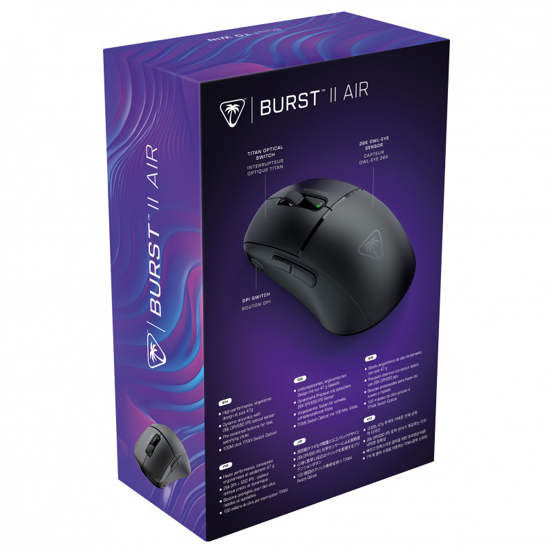 "Turtle Beach Burst II Air Black – 2.4GHz Wireless Gaming Mouse: 47g Ultra Lightweight, Optical Switches, 26K DPI Optical Sensor, Bluetooth, 120h battery. Form factor: Right-hand. Movement detection technology: Optical, Device interface: RF Wireless + Bluetooth, Movement resolution: 26000 DPI, Buttons type: Pressed buttons, Scroll type: Wheel, Acceleration (max): 50 G. Power source: Batteries. Product colour: Black"\n"The Turtle Beach® Burst II Air ultra-lightweight 2.4GHz wireless gaming mouse satisfies your need for speed at an incredible, best-in-class 47g. Designed for quick flick shots and the fastest players with a smooth yet precise Owl-Eye™ 26K DPI sensor with 650 IPS (16.5m/s) tracking speed, and blazing TITAN Optical Switches with adjustable debounce provides a long-lasting 100 million click life cycle, click tensioning and speed-of-light actuation for unprecedented speed and precision. The dual wireless system features 2.4GHz wireless for gaming (up to 40 hours of continuous use) and convenient Bluetooth® versatility (up to 120 hours) all in a right-handed symmetrical, solid top shell design. "