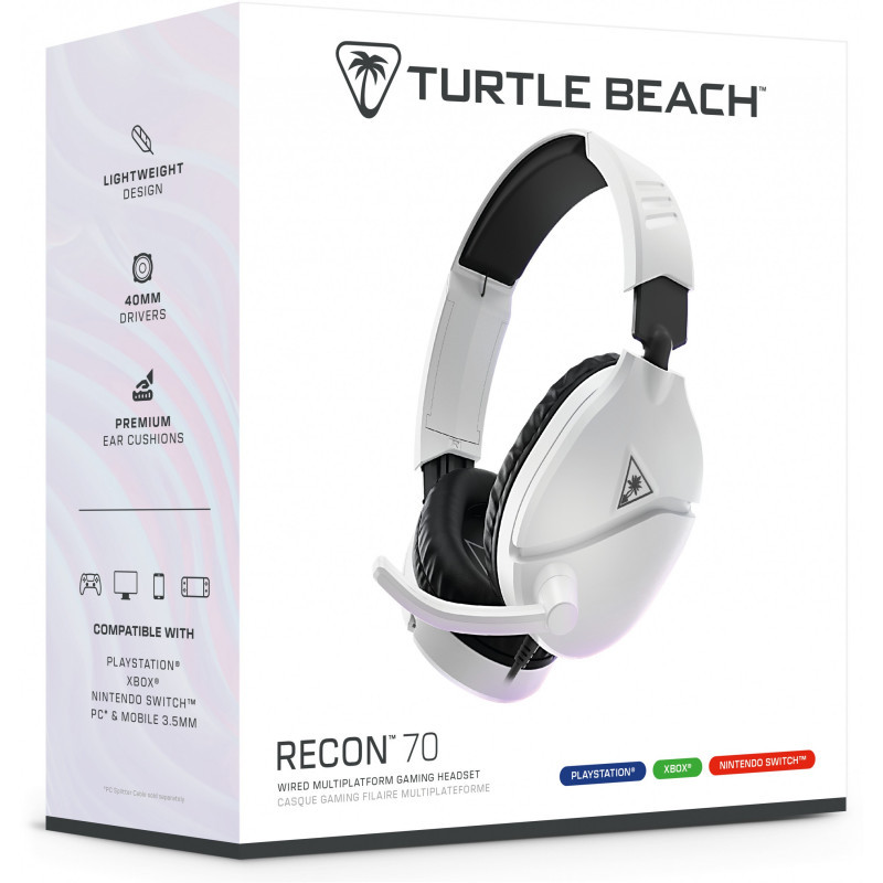 "Turtle Beach Recon 70 Black Wired Multiplatform Gaming Headset for PS5, PS4, Xbox Series X or S, Xbox One and Mobile with 3.5mm Wired Connection, Flip-to-Mute Mic, 40mm Speakers, Lightweight Design. Product type: Headset. Connectivity technology: Wired. Recommended usage: Gaming. Headphone frequency: 20 - 20000 Hz. Cable length: 1.2 m. Weight: 420 g. Product colour: White"\n"Built for your next victory, your latest achievement and much more is the Turtle Beach® Recon 70 multiplatform gaming headset. Featuring Turtle Beach’s latest lightweight and comfortable headset design for hours of play, with high-quality 40mm speakers and over-ear premium synthetic leather cushions that let you hear every crisp high and thundering low while blocking noise. Plus, for even more immersive audio, the Recon 70 supports spatial sound technologies like Sony 3D Audio for PS5™, Windows Sonic, Dolby Atmos, and DTS Headphone: X*. Turtle Beach’s renowned high-sensitivity mic to ensure you are heard clearly and easily flips up to mute. Finally, the versatile 3.5mm connection makes it perfect for swapping between PlayStation® and Xbox controllers, and PCs & mobile devices with 3.5mm connection. *Dolby Atmos and DTS:X: may require additional purchases, app downloads, and supported hardware."