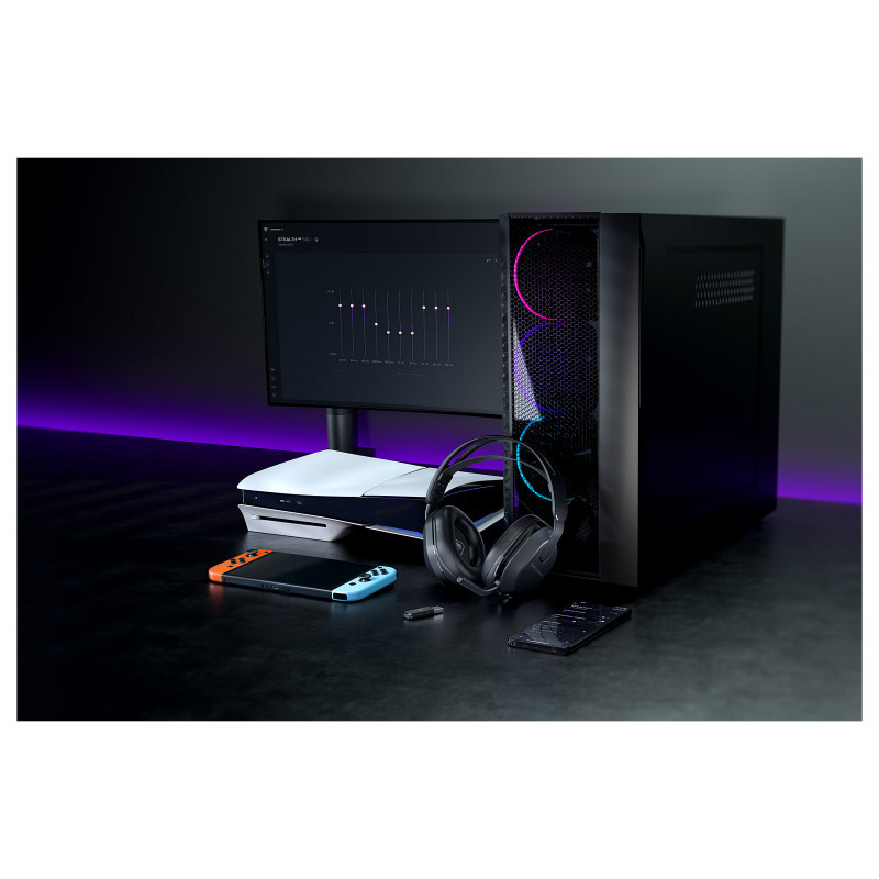 "Turtle Beach Stealth 500 Black PC Wireless Gaming Headset with up to 40hr Battery and Bluetooth for PC, PS5, PS4 and Mobile. Product type: Headset. Connectivity technology: Wireless, Bluetooth. Recommended usage: Gaming. Headphone frequency: 20 - 20000 Hz. Cable length: 2 m"\n"The Turtle Beach® Stealth™ 500 for Windows PCs, PS5™ & PS4™, & mobile devices redefines what an “entry-level” wireless gaming headset is capable of. Easily toggle between 2.4GHz wireless & Bluetooth® connections using the QuickSwitch button. A staggering battery life of up to 40 hours and an ultra-lightweight, floating headband design with memory foam cushions will keep you locked in the game for hours in complete comfort. Precision-tuned, amplified 40mm drivers along with extensive audio tuning in the Swarm™ II desktop & mobile apps deliver ultra-clear, customizable audio quality, optimized for spatial audio. Chat with ultra-clear voice accuracy thanks to the omni-directional, flip-to-mute microphone. "