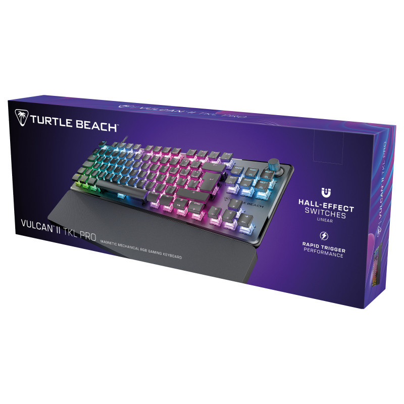 "Turtle Beach Vulcan II TKL Pro. Keyboard form factor: Tenkeyless (80 - 87%). Keyboard style: Straight. Connectivity technology: Wired, Device interface: USB, Keyboard key switch: Magnetic-mechanical key switch, Keyboard layout: AZERTY, Keyboard number of keys: 84. Backlight type: RGB LED, Wrist rest. Cable length: 1.8 m. Recommended usage: Gaming. Product colour: Black"\n"Insanely responsive, and immensely customizable, the Turtle Beach Vulcan II TKL Pro Magnetic Mechanical RGB PC gaming keyboard delivers pro-level performance in a compact TKL form. Equipped with analog hall-effect magnetic switches for silky smooth, reliable key presses rated at a 150M click lifecycle and they have a fully adjustable actuation point from 0.1mm to 4mm. And with Rapid Trigger setting, you’ll have better, more precise movement control, with less downtime between key presses. Lastly, the per-key AIMO™ Intelligent RGB lighting, five on-board profiles and adjustable actuation points can all be customized using the Swarm™ II desktop software.