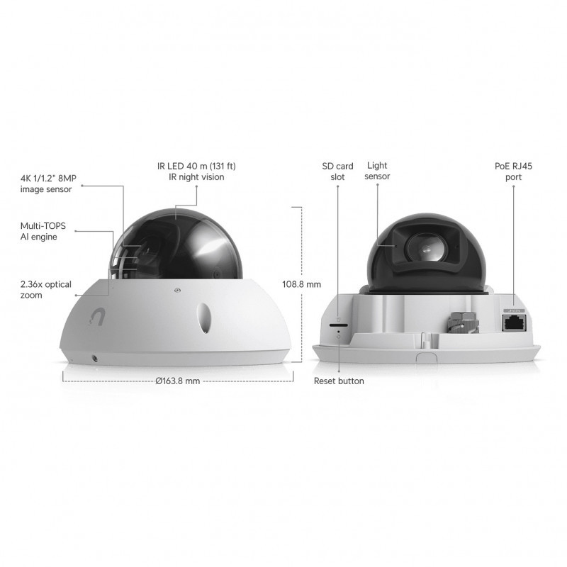 "Ubiquiti G6 Pro Dome. Type: IP security camera, Placement supported: Indoor & outdoor, Connectivity technology: Wired. Mounting type: Ceiling/wall, Product colour: White, Form factor: Dome. Lens viewing angle, horizontal: 113.8 - 45.5°, Lens viewing angle, vertical: 61.9 - 25.8°, Lens viewing angle, diagonal: 134 - 52°. Sensor type: CMOS, Optical sensor size: 25.4 / 1.2 mm (1 / 1.2""). Optical zoom: 2.36x, Focal length range: 5.9 - 13.8 mm"\n"All-weather vandal-proof 4K PoE+ camera with a Multi-TOPS AI engine, 2.36x optical zoom, and a large 1/1.2"" CMOS sensor for exceptional low-light clarity and long-range IR night vision."