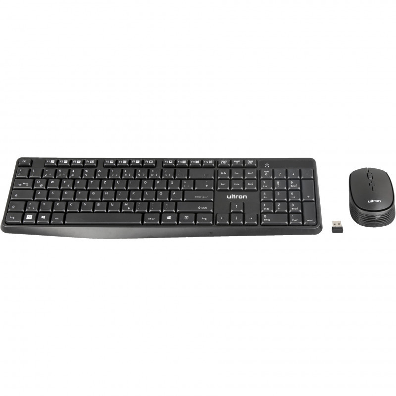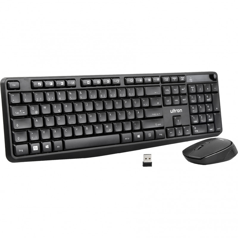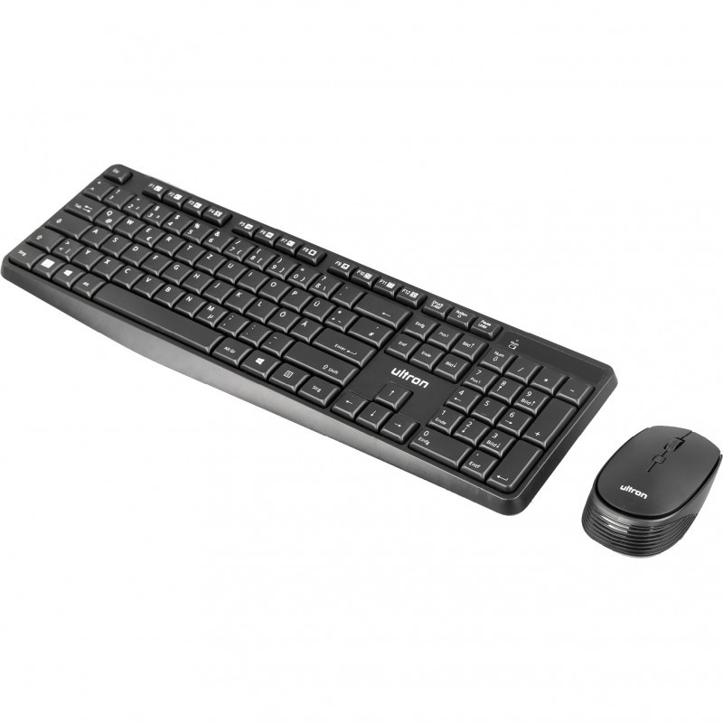 "Ultron UMC300. Keyboard form factor: Full-size (100%), Connectivity technology: Wireless, Device interface: RF Wireless, Recommended usage: Universal. Product colour: Black. Mouse included"\n"With the UMC300, ultron offers a combination of wireless mouse and keyboard with 2.4 GHz technology. Thanks to its 1,600 dpi sensor, the mouse glides smoothly over the screen. With its German layout and 12 multimedia keys, the keyboard makes typing on the PC easy. Thanks to Easy Link technology, only one nano receiver is needed to connect both devices."
