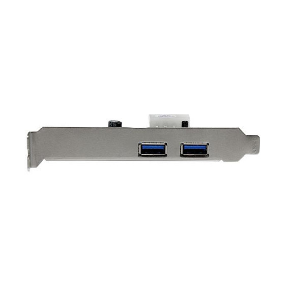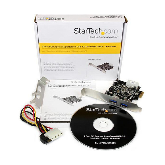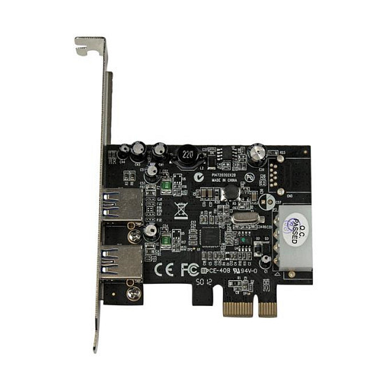 "StarTech.com 2 Port PCI Express (PCIe) SuperSpeed USB 3.0 Card Adapter with UASP - LP4 Power. Host interface: PCIe, Output interface: USB 3.2 Gen 1 (3.1 Gen 1), Expansion card form factor: Full-height / Low-profile. Maximum cable length: 3 m, Certification: CE, FCC. Chipset: Renesas / NEC - µPD720202, Data transfer rate (max): 5 Gbit/s. Windows operating systems supported: Windows 10 Education, Windows 10 Education x64, Windows 10 Enterprise, Windows 10 Enterprise x64,..., Server operating systems supported: Windows Server 2003, Windows Server 2008 R2, Windows Server 2012, Windows Server 2012 R2, Windows.... Width: 18 mm, Depth: 82 mm, Height: 120 mm"\n"Add 2 SuperSpeed USB 3.0 (USB 3.2 Gen 1) ports to your PCI Express-enabled PC