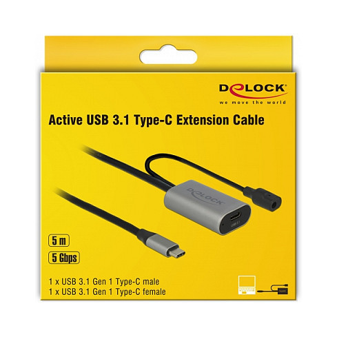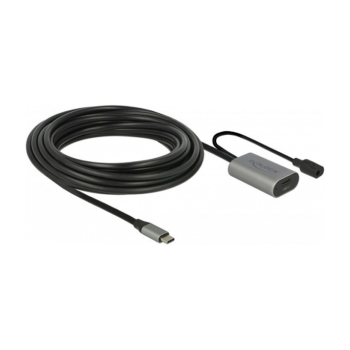 "DeLOCK 85392. Cable length: 5 m. Connector 1: USB C, Connector 2: USB C, USB version: USB 3.2 Gen 1 (3.1 Gen 1), Product colour: Black, Grey"\n"This active USB cable by Delock can be used to extend a USB connection by 5 m. The cable has an additional DC power socket to which an optional power supply can be connected. This ensures optimum data transmission even when used with powerful devices such as a 2.5″ hard drive."