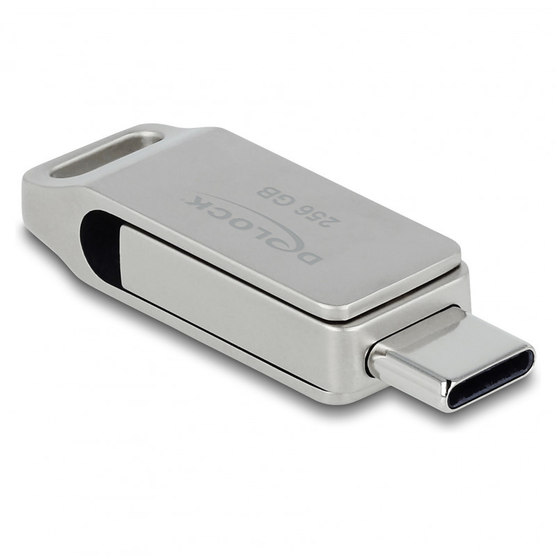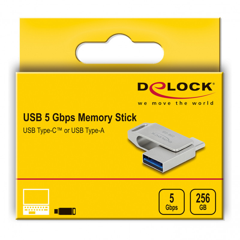 "DeLOCK USB 5 Gbps USB-C + Type-A Memory Stick 256 GB - Metal Housing. Capacity: 256 GB, Device interface: USB Type-A / USB Type-C, USB version: 3.2 Gen 1 (3.1 Gen 1), Read speed: 116 MB/s, Write speed: 86 MB/s. Form factor: Swivel, Product colour: Grey"\n"This USB memory stick by Delock can be used to save and transport data, e.g. photos, videos or music. The USB stick can be connected optionally via the USB Type-C™ or USB Type-A plug, the inner part is simply turned and then latch into place. Due to the stylish design with eyelet, the small USB memory stick can be easily attached to the key ring for transport."