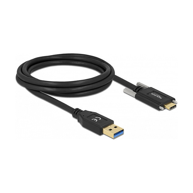 "DeLOCK SuperSpeed USB (USB 3.2 Gen 2) Cable Type-A male to USB Type-C male with screws on the sides 2 m. Cable length: 2 m. Connector 1: USB A, Connector 2: USB C, USB version: USB 3.2 Gen 2 (3.1 Gen 2), Maximum data transfer rate: 10 Gbit/s, Connector contacts plating: Gold, Product colour: Black"\n"This USB cable by Delock allows the connection between devices with a USB Type-C™ connector and a PC or laptop with a free USB port. The screws of the USB Type-C™ connector secure the connection and prevent accidental unplugging of the cable."