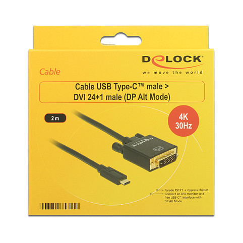 "DeLOCK 2m, USB-C/DVI 24+1. Maximum resolution: 3840 x 2160 pixels, Supported video modes: 2160p, Chipset: Parade PS171 + Cypressf. Product colour: Black. Package type: Box. Quantity per pack: 1 pc(s)"\n"This cable by Delock enables the connection of a DVI monitor to a PC or laptop with USB-C™ or Thunderbolt™ 3 port, such as a MacBook or a Chromebook. The interface has to support the Displayport Alternate Mode."