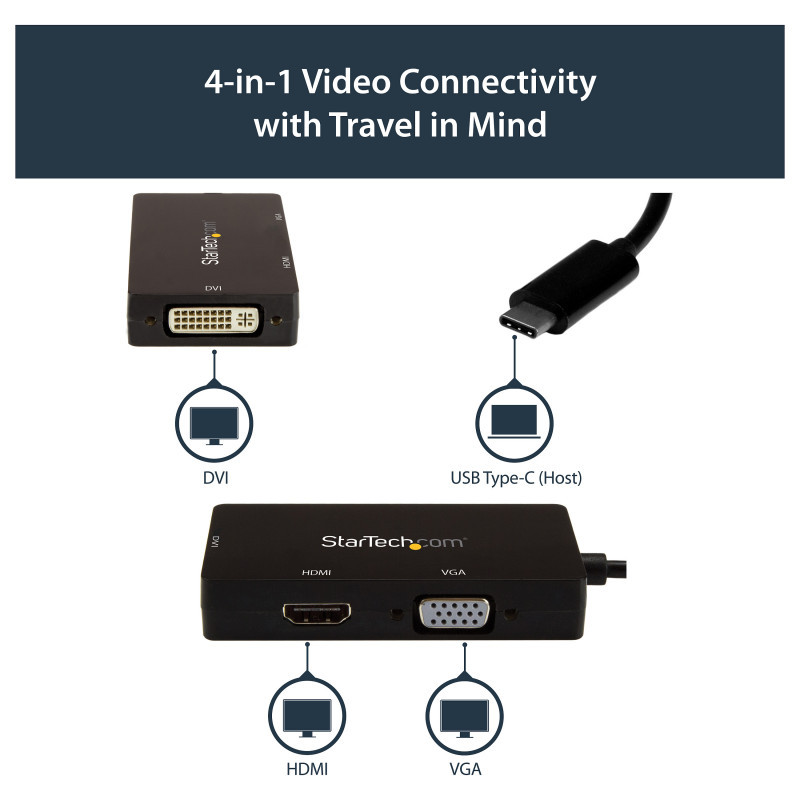 "StarTech.com USB-C Multiport Video Adapter - 3-in-1 - 4K 30Hz - Black. USB connector type: USB Type-C, USB connector gender: Male, Maximum transfer distance: 15.2 m. Product colour: Black. Width: 45 mm, Depth: 85 mm, Height: 15 mm. Package width: 125 mm, Package depth: 225 mm, Package height: 20 mm. Products per master (outer) case: 150 pc(s), Master (outer) case width: 330 mm, Master (outer) case length: 490 mm"\n"USB Type-C™ to VGA DVI or HDMI Travel Adapter | 3-Year Warranty