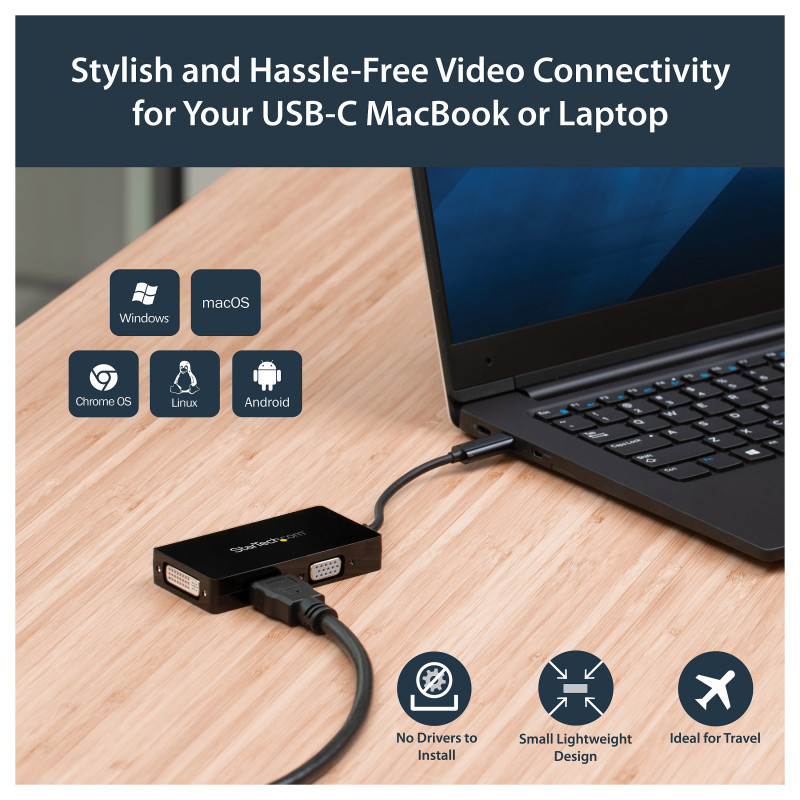 This USB-C™ multiport video adapter offers a portable solution for connecting your USB Type-C laptop to a VGA, DVI or HDMI® display.