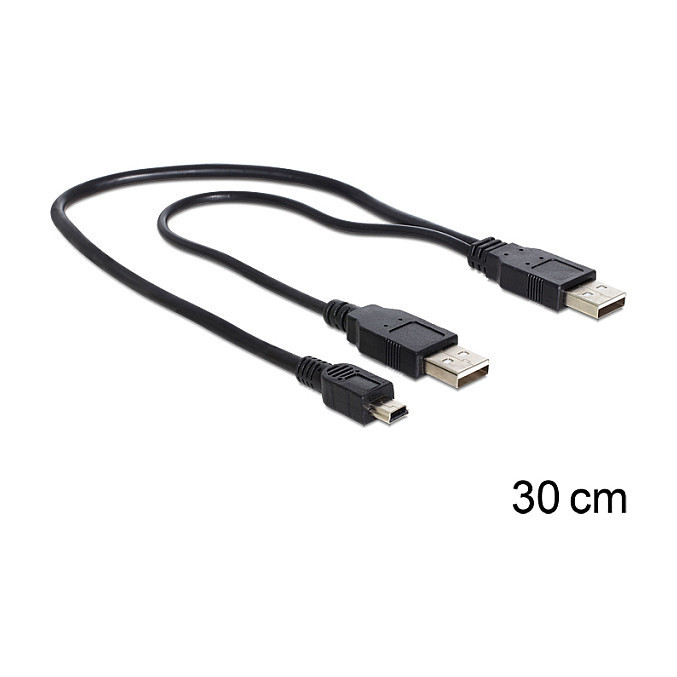 "DeLOCK 83178. Cable length: 0.3 m. Connector 1: 2 x USB A, USB version: USB 2.0, Connector gender: Male/Male, Maximum data transfer rate: 0.48 Gbit/s, Product colour: Black"\n"This USB Y-cable by Delock can be connected to 2 free USB ports of your PC or notebook and enables you to provide power different devices with USB mini 5 pin interface, e.g. 2.5″ enclosure etc."