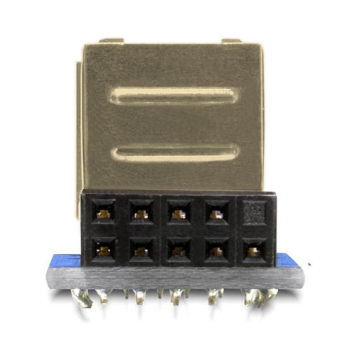 "DeLOCK 1 x 9-pin 2.54 mm/2 x USB 2.0-A. Connector 1: 1 x 9-pin 2.54 mm, Connector 2: 2 x USB 2.0-A. Product colour: Black, Blue, Silver"\n"This USB pin header can be plugged to a free USB pin header male of your mainboard in order to expand your system internally by 2 USB-A ports. Thus you can use e.g. connect an USB memory stick or USB-WLAN stick. Based on the mainboard, both USB ports are aligned upwards and stacked. "