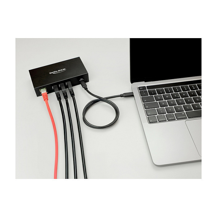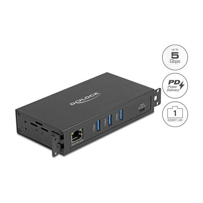 "DeLOCK 3 Port USB 5 Gbps Hub + RJ45 Gigabit LAN PoE++ Port with USB Type-C host-connector in metal case and 1.5 kV Isolation. Host interface: USB 3.2 Gen 1 (3.1 Gen 1) Type-C, Hub interfaces: RJ-45, USB 3.2 Gen 1 (3.1 Gen 1) Type-A. Data transfer rate: 5000 Mbit/s, Product colour: Black, Housing material: Metal. Ethernet interface type: Fast Ethernet, Gigabit Ethernet, Ethernet LAN data rates: 10,100,1000 Mbit/s, Networking standards: IEEE 802.1Q, IEEE 802.3, IEEE 802.3ab, IEEE 802.3at, IEEE 802.3az, IEEE 802.3bt, IEEE 802.3u. Power supply type: USB. Windows operating systems supported: Windows 10, Windows 10 x64, Windows 11, Mac operating systems supported: Mac OS 14.5, Mac OS X 15.0 Sequoia, Linux operating systems supported: Linux Kernel 6.5"\n"This solid USB hub by Delock with metal housing can be connected to a computer, laptop or mobile device via the USB-C™ interface. Up to 3 USB devices can be connected to the hub.